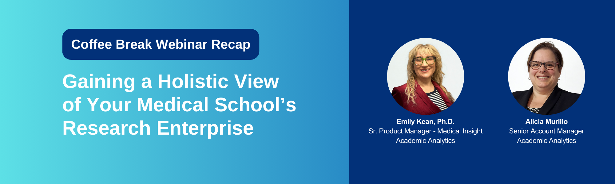 At our most recent Coffee Break, Gaining a Holistic View of Your Medical School’s Research Enterprise, the Academic Analytics team explored one of the most pressing challenges medical schools face today: how to truly understand, and communicate, the full scope of their research activity.